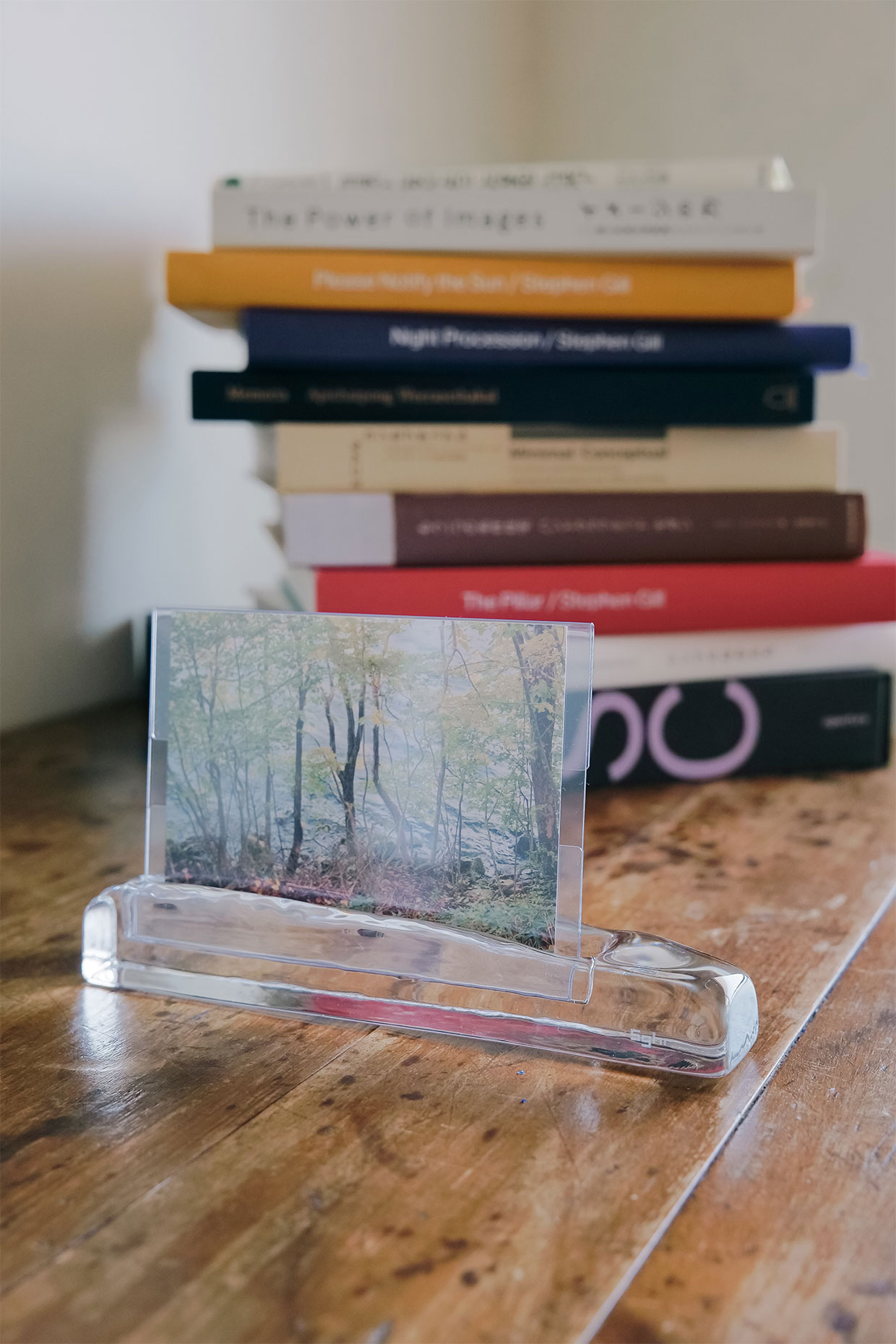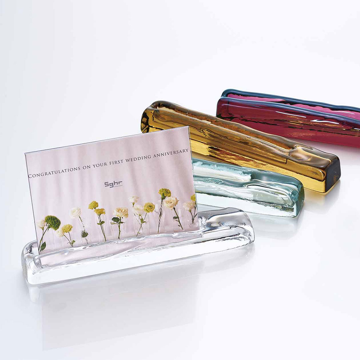 細長い棒状のガラスにある溝に、写真やポストカードを差し込んでお使いいただけます。