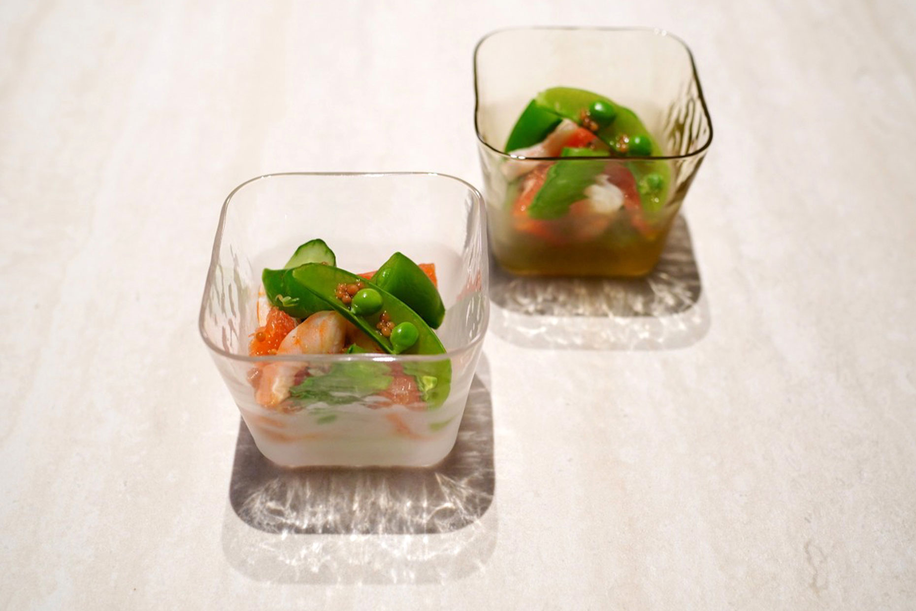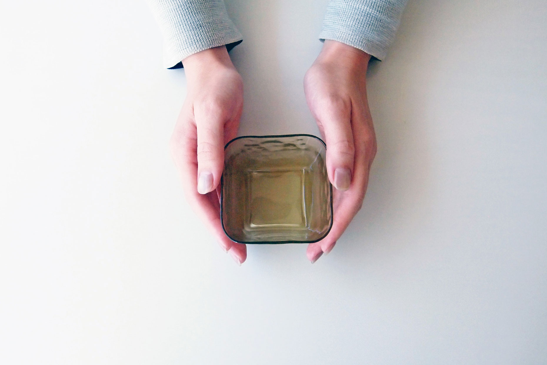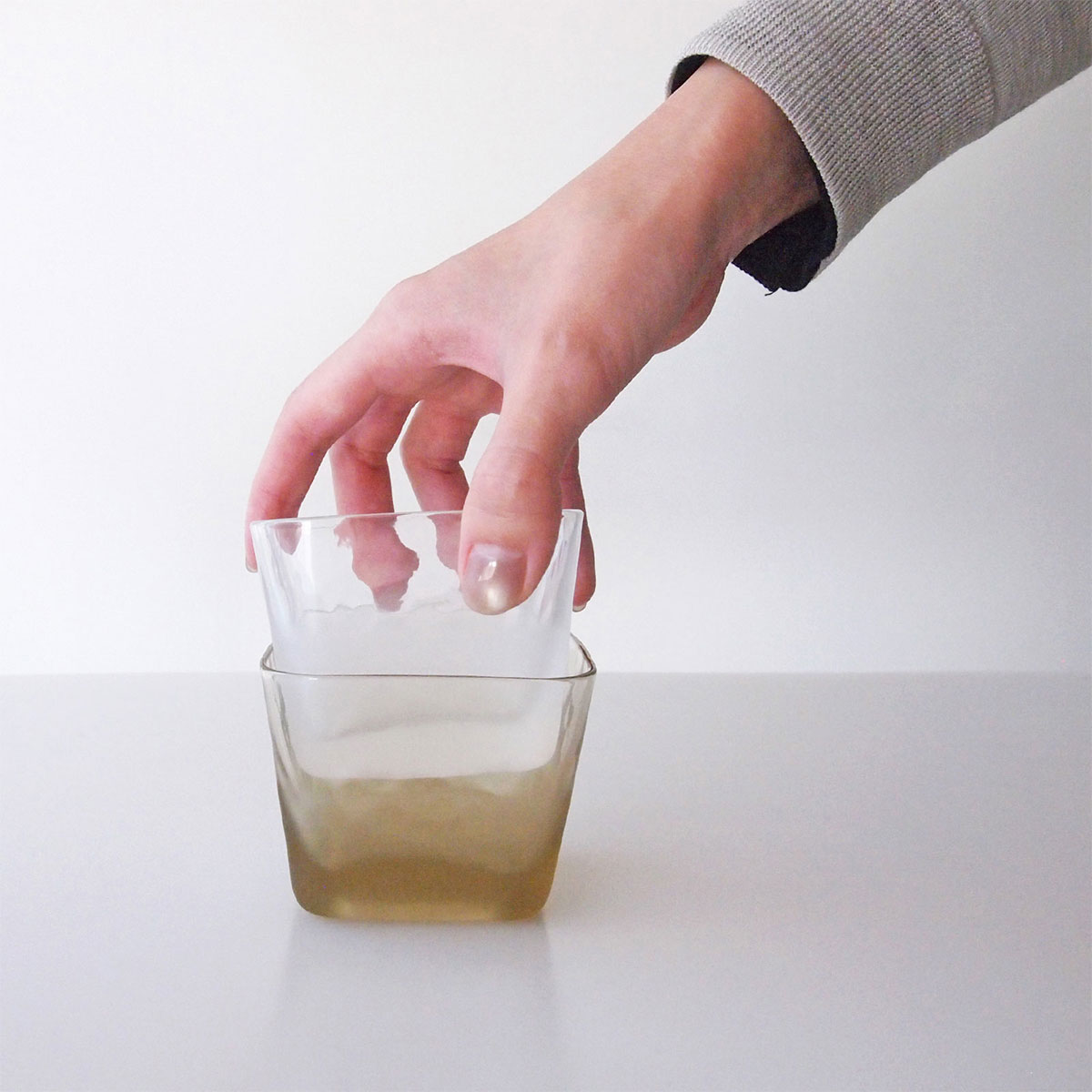 上下のガラスをクリアと不透明に分け、ほんのり中の色が透けてどの料理でも馴染むようにしました。